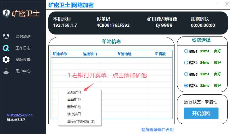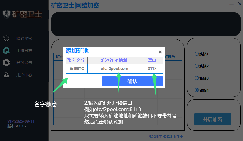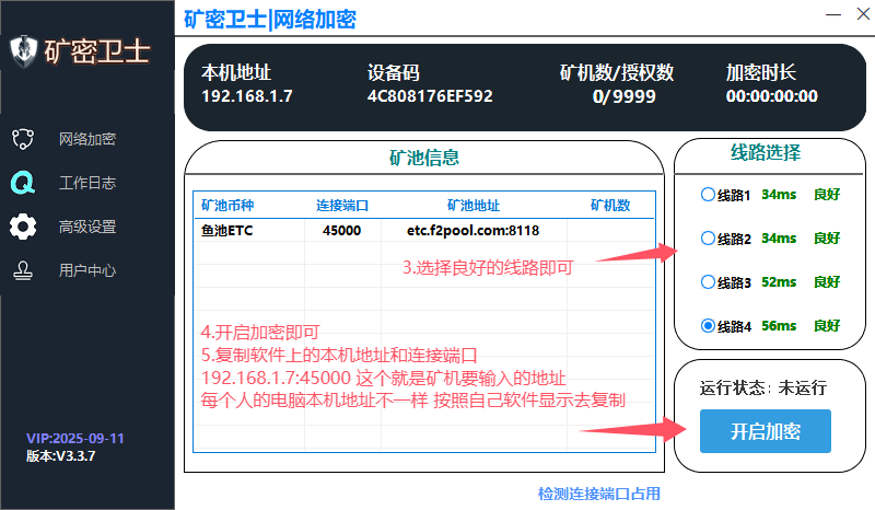 3.选择线路 4.点击开启加密